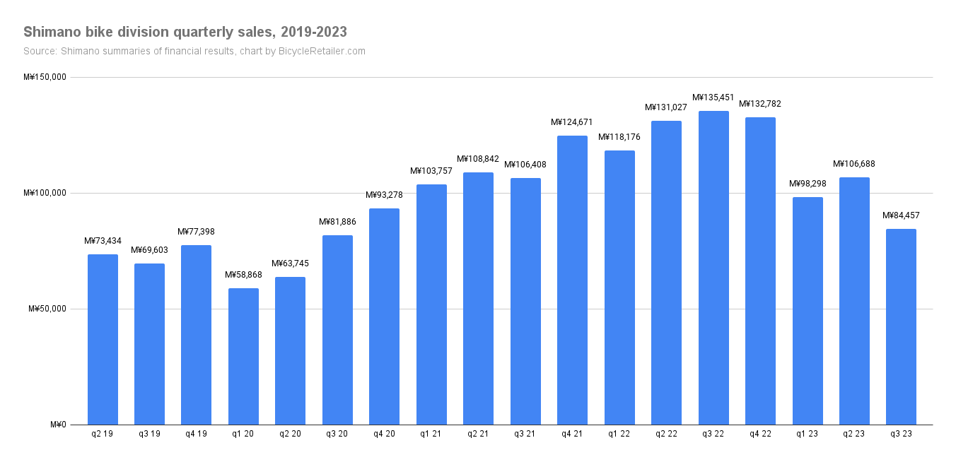 Unternehmensweit sank der Nettoumsatz von Shimano im Vergleich zum Vorjahr um 19,8 % auf 375,264 Milliarden Yen (2,5 Milliarden US-Dollar). Das Betriebsergebnis sank um 43,0 % auf 72,086 Milliarden Yen, das ordentliche Einkommen sank um 35,8 % auf 96,221 Milliarden Yen und der Nettogewinn sank um 47 % auf 60,169 Milliarden Yen.