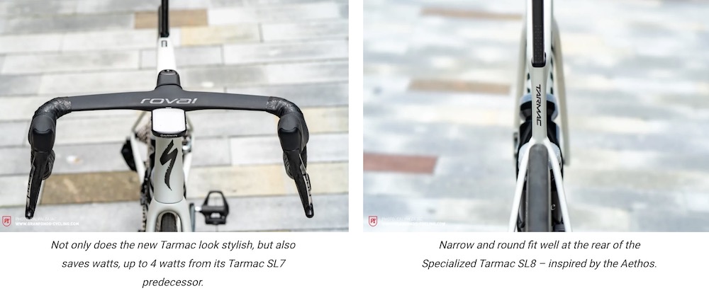 Die zweite große Änderung ist das einteilige Cockpit. Kurz vor der Markteinführung stellte Specialized das neue Roval Rapide-Cockpit vor, das auch mit dem alten Tarmac SL7 kompatibel ist, der auf einer herkömmlichen Vorbau-Lenker-Kombination basiert. Das neue Cockpit-Design spart im Vergleich zum Vorgänger bis zu 4 Watt, ist aber derzeit nur bei den S-Works-Modellen verfügbar. Obwohl diese Innovation in puncto Energieeinsparung überzeugend ist, sind einteilige Aero-Cockpits bei Rennrädern nichts Neues und schon seit mehreren Jahren im Einsatz.