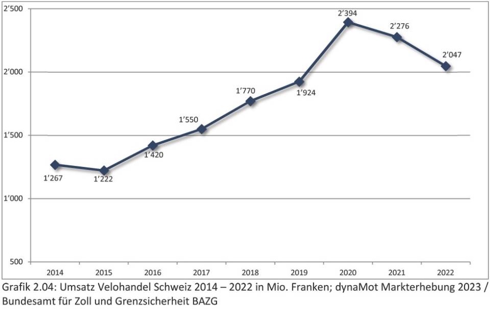 Der Schweizer Fahrradexperte Urs Rosenbaum erklärte, dass die Fahrradindustrie zwar bis 2023 unter schwierigen Bedingungen arbeiten muss, langfristig aber auf Erfolgskurs sei. Die professionelle Agentur Dynamot hat die Importstatistik von Velohandel im kürzlich vom Bundesamt für Zoll und Grenzsicherheit veröffentlichten Marktbulletin 2023 ausgewertet. Er beschrieb eine ähnliche Achterbahnfahrt mit Deutschland: Nur etwa 50 bis 70 Prozent der regulären Nachfrage aus wichtigen Produktionsländern werde im ersten Halbjahr 2022 in Deutschland eintreffen. Im Hochfrühjahr habe es zunächst einen Mangel an Fahrrädern mit und ohne Motor gegeben Jahreszeit. Umsatzentwicklung im Schweizer Fachhandel seit 2014.