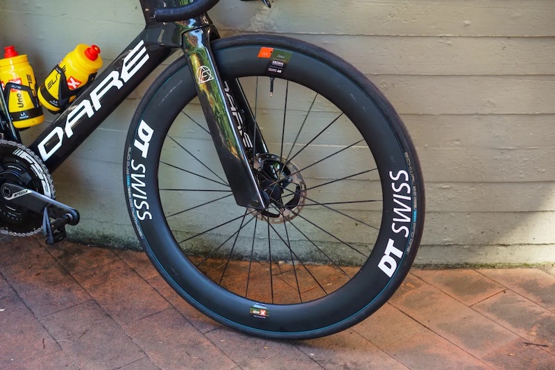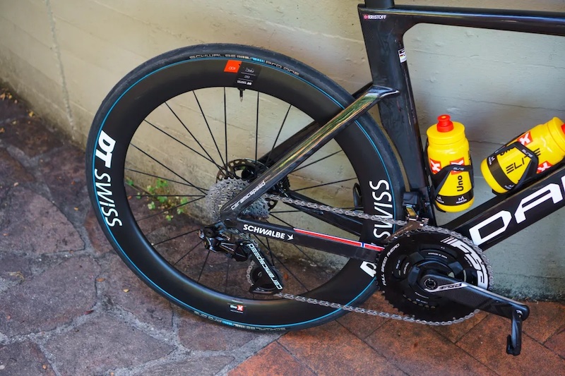 Like last year, Kristof’s wheelset of choice is the DT Swiss ARC 1100 Dicut DB, with 62mm-deep rims.