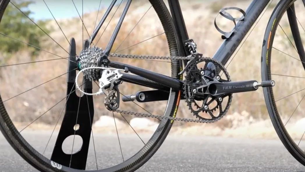Der Antriebsstrang wird durch die charakteristische THM-Kurbelgarnitur vervollständigt, die im gesamten ultraleichten Fahrradbau zu finden ist.